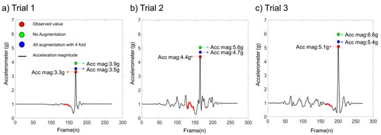 Figure 6 presents results of a fall impact acceleration magnitude prediction model proposed in this study. A bi-directional LSTM algorithm for deep learning was applied to predict the magnitude of acceleration at impact point since collected accelerometer and angular velocity signals were of time-series type. Time-series data near a point when a subject lost balance shown in red were used as input data for the LSTM model to predict the observed value shown in green dot which was the actual impact acceleration magnitude value. In this study, five different directions of fall (front, back, left, right, and straight) experimental data were collected. Additionally, we generated new dataset using data augmentation technique at four different values to increase datasets by 4-fold. As shown in Figure 6, the impact acceleration magnitude value varied throughout datasets since characteristics of person falling, direction of falling, and anthropometric measurements were different. For instance, heights and weights of participants of this study were different. The activity prior to falling such as standing or walking showed different acceleration values which could affect the falling speed. The time between the start of the critical phase to impact was also different. Predicted results without augmentation approaches from our proposed model for different levels of acceleration magnitude were determined. MAPE values for all augmentation approach datasets with a 4-fold data size increment in trials 1, 2, and 3 were 6.9%, 7.5%, and 7.8%, respectively; lower than those without an augmentation approach (27.8%, 29.1%, and 30.5%, respectively).