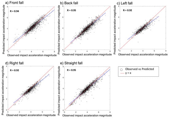 Additionally, we analyzed how well our proposed model could predict the impact acceleration magnitude using a linear regression model for five fall directions. Results are shown in Figure 7. Our proposed model results showed r values of 0.7, 0.76, 0.75, 0.75, and 0.814 for front, back, left, right, and straight falls, respectively, when all-data augmentation approach was applied with onefold increment dataset. Compared to onefold dataset results, the fourfold dataset increment model was able to predict impact acceleration magnitude significantly better, with r values of 0.94, 0.95, 0.92, 0.92, and 0.95 for front fall, back fall, left fall, right fall, and straight fall, respectively.