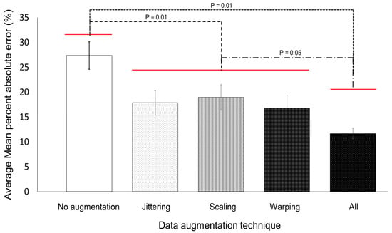 As shown in Figure 8, the all-data augmentation technique dataset achieved a significant (p = 0.01) decrease of average MAPE by 55.8% compared to the no-data augmentation dataset. Similarly, there was a significant (p = 0.01) difference in average MAPE value by 32.4% between results of single augmentation approach-applied dataset (jittering, scaling, and warping) and all-data augmentation technique-applied datasets. However, there was no significant difference in the performance between each single-data augmentation group and the all-data augmentation group. In summary, data augmentation technique seems to be effective for predicting impact acceleration magnitude prior to a subject’s impact on the ground.