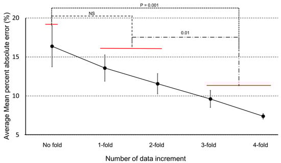 Average mean absolute percent error of fall impact acceleration magnitude prediction depending on the number of datasets with increasing fold of datasets.