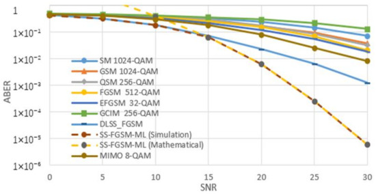 In this subsection, we will analyze the ABER performance of the SS-FGSM ML-based detector (MLSS-FGSM). The ABER is a function of the probability of corrupted bits due to detecting the transmit active antennas, spreading codes of real and imaginary parts of the modulated signal, and the modulated signal itself. In other words, ABER is a function of physical transmitted modulated bits and mapped data bits, including the bits transmitted by indices of antennas and the bits transmitted by the indices of spreading codes. We denote the probability associated with erroneous antenna detection by the probability associated with erroneous spreading code by ; and finally, the probability associated with the modulated bits by . The ABER of the proposed SS-FGSM scheme can be formulated as: