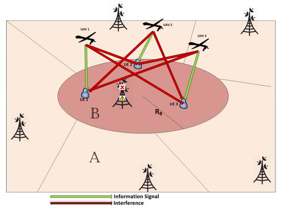 Considering the interference from other co-channel ABSs is crucial when positioning an ABS [3]. In contrast to the works in [3,9,26], we consider the full impact of CCI in the ABS placement and UE association problems. Figure 2 illustrates a sample scenario of our proposed system. The SINR of the UE associated with the ABS is given by