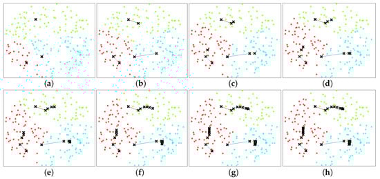 Illustration of ABS placement and UE association obtained using the approach in [14], where = 2000 m, , , /m, , , = 300 m, . The position of the ABS is represented using X. The three colors differentiate the UE clusters at a particular stage. (a–h) illustrate the , …, , , and adaptive stages, respectively