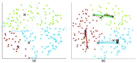 Illustration of the movement of the aerial base stations (ABSs) in the 2D plane for suburban environment. The position of the ABS is represented using x. The three colors differentiate the UE clusters of the respective ABSs. (a) Initial 2D position of the ABSS. (b) Movement of the ABSs to the computed position. The solid arrow represents the actual ABS movement. The doted lines represent the adaptive process (does not represent the movement) performed at the CC. = 2000 m, , , = 2 × 10/m, , , = 300 m, .