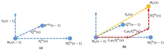 (a) Global best, local best, position, and the velocity in the ()th iteration. (b) Velocity in the iteration as a weighted vector addition of previous velocity components and the position in the iteration.