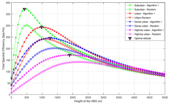 Total spectral efficiency vs. altitude of the ABS (comparison between Algorithm 1-based deployment and random deployment).