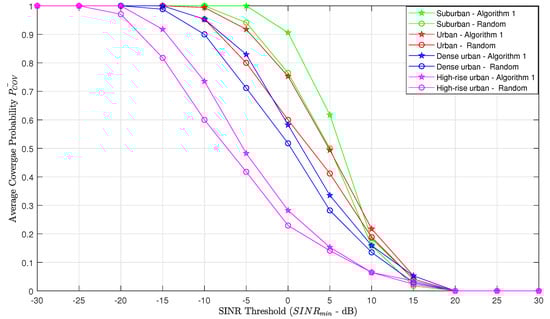 To compare Algorithm 1 with naive random deployment in terms of coverage probability, we evaluate the average coverage probability for each propagation environment, when the ABSs are placed at their optimal altitudes. From Figure 6, the optimal altitudes of the ABSs are considered as 300 m, 650 m, 800 m and 1250 m for suburban, urban, dense urban and high-rise urban, respectively. Figure 8 shows how the coverage probability behaves with the SINR threshold. It is conspicuous that the average coverage probability of Algorithm 1 is superior to random deployment.