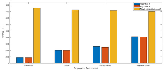 Figure 9 presents the total consumed energy for ABS movements using Algorithm 1, Algorithm 2, and naive exhaustive search, where the search is performed over all possible altitudes. Both proposed algorithms have almost similar energy consumption, while being significantly lower (9-fold saving) than the naive exhaustive search. This is due to the reduced number of ABS movements we need to perform with the proposed centralized approach. It is interesting to note that energy saving decreases from suburban to high rise urban due to the increase in the optimal altitude.