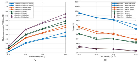 (a) Maximum achievable total spectral efficiency (TSE) vs. user intensity (b). Energy consumption for maneuvering vs. user intensity.
