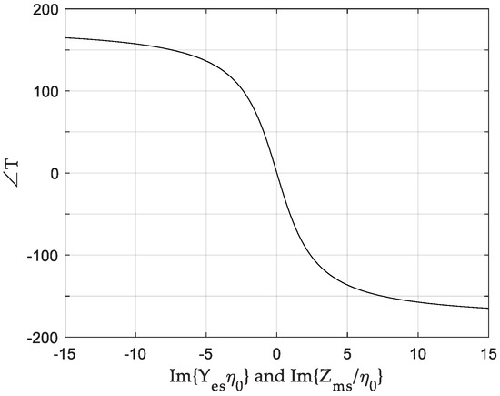 Here, is the intrinsic impedance of free space. Equations (3) and (4) indicate that a reflectionless (R = 0) metasurface requires the same values of and . To maintain almost perfect transmission (T = 1) with wide transmission phase variation, only the imaginary part of and should be utilized. Figure 1 shows that the simultaneous change of Im{} and Im{} from −15 to 15 covers transmission phases from −165° to 165°. Here, and are purely imaginary numbers.