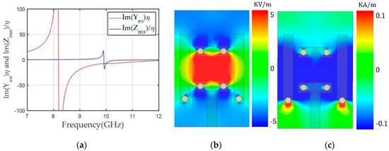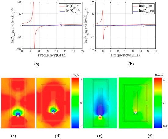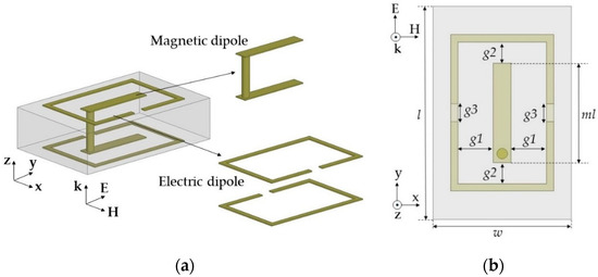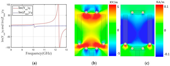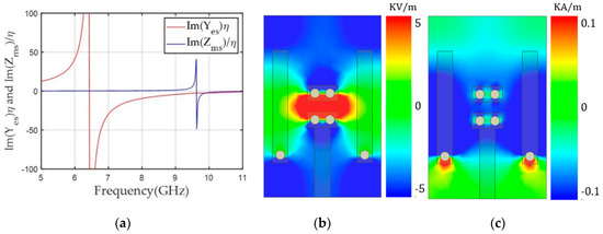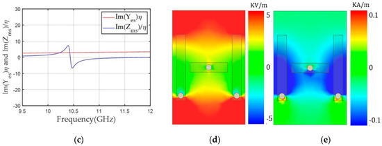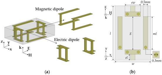Here, the alignment of both dipoles was based on a y-polarized TEM wave propagating along the z-axis. The unit cells were simulated using Ansys high frequency structure simulator (HFSS) and the excitation and boundary conditions were used with wave ports and perfect electric conductor (PEC)/perfect magnetic conductor (PMC) boundaries, respectively. In the design, we used a 1.6 mm-thick double-layer FR4 substrate with a relative permittivity (εr) of 4.3 and loss tangent (tan δ) of 0.008. The unit cell area was fixed to a length (l) of 6 mm and width (w) of 3.9 mm. We used the rectangular-shaped unit cell to support long asymmetric current flow and a close space between the two magnetic dipoles to achieve a high Zms value and a low discretization error along the x-axis. Geometrical parameters of the unit cell included ml (the length for the magnetic dipole), g (the gap between the capacitively coupled electric dipoles), and ew (the width of the capacitor of the electric dipoles). Last, el indicates the electric dipole length, which is dependent on g. Therefore, we varied ml for the desired values and g and ew for the tuning. One benefit of this unit cell topology is that electric and magnetic resonance can be controlled independently because both electric and magnetic structures are implemented perpendicularly by the intuition of Huygens’ surface electric and magnetic currents. Finally, a unit cell with ml = 3.64 mm, g = 3.68 mm, and ew = 1.7 mm achieved high and values of 7.55 and 5.87, respectively, with an S21 of −0.96 dB and −150° transmission phase. To balance and , resonance where the peak of Yes occurs has to be located near 12.4 GHz, which was implemented with lower capacitance by using a wide gap distance (g = 3.68 mm) between the two electric dipoles, as shown in Figure 3b. However, the resonance should be near 10 GHz to achieve a sufficiently high value to match the value at 10 GHz. Figure 3c shows a high magnetic field excited along the x-axis due to current flows on the magnetic dipoles.