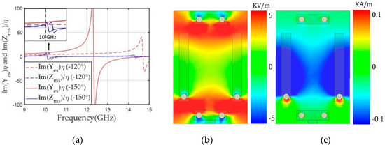 For negative transmission phases, we used the unit cell for −150° and achieved −120° by increasing the and resonance frequencies. For lower effective capacitance and inductance of the unit cell, the gap (g) between the electric dipole was increased from 3.68 to 4.60 mm and the magnetic dipole length (ml) was shortened from 3.64 to 3.61 mm. Finally, lower positive (3.9) and (2.8) values at 10 GHz were achieved with a low S21 of −0.72 dB. Figure 6a shows the and values according to frequency for the unit cells for the −150° and −120° phases. Lower Yes and values were observed for the −120° case at 10 GHz due to the higher Yes resonance frequency near 14.8 GHz. The lower value in the −120° case was due to a resonance frequency shift to a higher frequency near 10.2 GHz. Figure 6b shows that Ey for the unit cell with the −120° phase was distributed over a larger area than observed for the −150° case (Figure 3a). Figure 6c for Hx also shows lower magnetic fields between two magnetic dipoles. Both trends correspond to higher resonance frequencies for both and and lower values at 10 GHz for the −120° case.