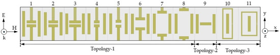 Figure 10 provides a top view of all the unit cells with topologies 1, 2, or 3. and values of the corresponding unit cells and their transmission parameters are presented in Table 1. The highest and lowest transmission loss levels were −1.1 and −0.34 dB, respectively, and the average loss was −0.82 dB, which was lower than the average S21 of −1.04 dB reported for a similar double-layer PCB-based unit cell operating at 10 GHz [32]. Moreover, previously reported structures had a maximum transmission loss of −2.5 dB, while that of the proposed unit cells was −1.1 dB. These findings demonstrate that unit cell topologies optimized for specific transmission phases significantly reduce transmission loss of the overall unit cells.