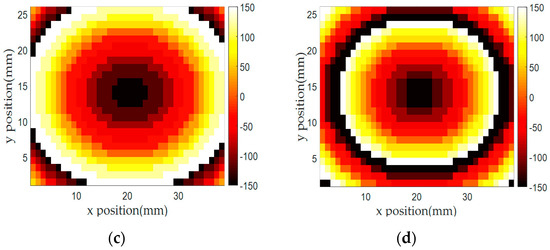 In Equation (5), is the distance between the center of the unit cell element and the focal point and f is the focal distance. We used the wavenumber () from the 10 GHz frequency and set to −150° as the default phase at the center of the array where and f are equal. One thing to note is that due to the unit cells’ compact size, steeper phase changes required for short focal distances could be realized with a low discretization error. Finally, we arranged different numbers of rectangular-shaped (3.9 × 6 mm) unit cells along the x-axis (39 cells) and y-axis (26 cells) to realize a near 5λ × 5λ-sized (152.1 × 156 mm) focusing lens. Figure 11c,d shows the implemented phase distribution of both focusing lenses. Because the calculated phases near the center of the focusing lenses were located in the middle of the 30° phase gap of the unit cells, a slight phase difference between Figure 11a,b and Figure 11c,d near the center area was allowed in the design process.