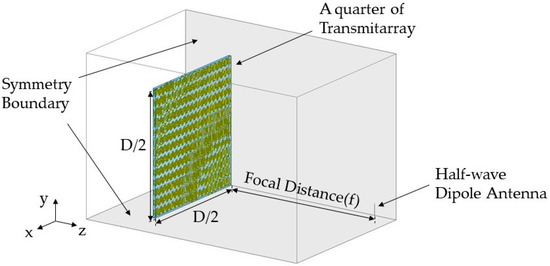 Simulation setup for the focusing lens with a half-wave dipole antenna as a feeding source in symmetry boundaries.