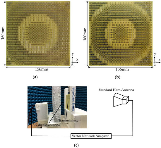 Top view of the fabricated focusing lenses with (a) 100 mm focal distance and (b) 60 mm focal distance. (c) Setup for measuring the focusing gain of the focusing lens using a half-wave dipole antenna as the feeding source and a standard horn antenna. Both antennas were connected to a vector network analyzer.