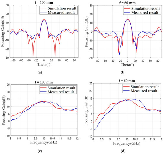 Simulated and measured and focusing gain patterns on the x-z plane with a function of theta at 10 GHz from the focusing lenses (a) with f = 100 mm and (b) with f = 60 mm. Simulated and measured focusing gain according to frequency from (c) f = 100 mm and (d) f = 60 mm.