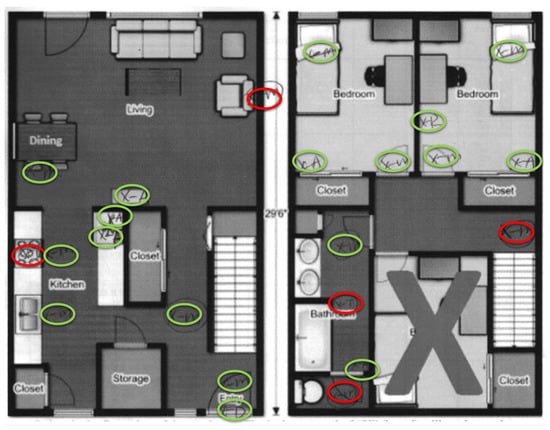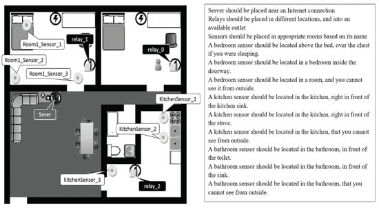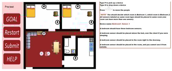The experiment was conducted in an apartment with three bedrooms, one bathroom, one living room, and one kitchen for 1106 square feet. In the experiment, participants needed to install sensors in two bedrooms. Before beginning, each participant is surveyed about their background, including age, gender, native language, and others. In the experiment’s training part, participants in the control group were given a booklet with three examples of a correct smart home sensor arrangement on a floorplan layout. An example of the layout is shown in Figure 1. Details of the training contents of the control group are shown in Section 2.3.1.