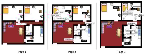 Worked examples shown in the booklet are in a sequence from simple to complicated. Page 1 shows an example of a solution to place three devices. The problems on pages 2 and 3 are more complicated in which ten devices need to be placed. Example solutions on pages 2 and 3 show two ways for placing ten devices. The purpose of showing two solutions is to highlight alternate solutions to the learners. Figure 3 shows the three worked examples of the booklet. The house layouts of the three examples are identical. On page 1, the three devices are a room sensor, a relay, and a server. On pages 2 and 3, there are three room sensors, three relays, three kitchen sensors, and a server. The example on page 3 is an alternative solution to the problem set. For example, the three room sensors are placed in the bedroom on the left on page 2, while on page 3 they are placed in the right bedroom. Positions of relays and kitchen sensors on page 3 are changed from those on page 2.