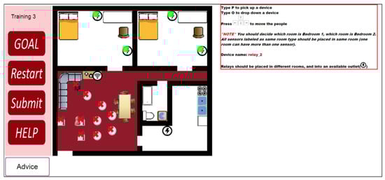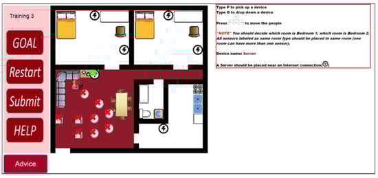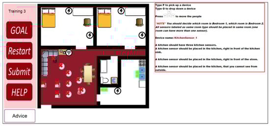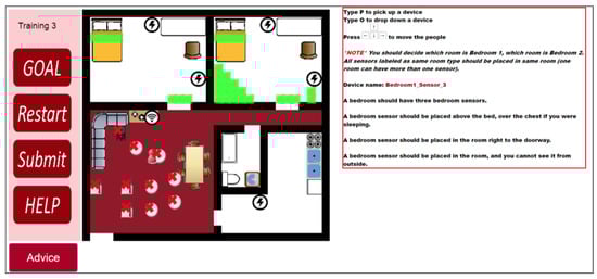 The room layouts for the three training exercises are identical to the contents of the control group booklet. In the first two training exercises, participants need to follow worked examples to place given devices. In the third training exercises, participants need to find the correct place for the devices. The tutoring system will give suggestions after participants placed all the devices. Figure 4, Figure 5, Figure 6 and Figure 7 are examples of the third training exercise. Every time a participant presses the “Submit” button, the CBLE verifies the devices’ placement. When the CBLE detects a device is at the wrong place, it shows an X on the device. The participant can move the red avatar and use it to pick up the incorrectly placed device and then click the “Advice” button at the bottom right. The CBLE will then highlight all the correct areas for that device. As shown in Figure 4, the name of the device is “Bedroom1_Sensor_3” All sensors applied in the study are manufactured by Card Access Engineering Inc, Draper, UT 84020, USA, a partner of Control4, which is in red at the right. The tutorial suggests three correct places: above the bed, at the door, or in the area in a bedroom such that no one can see it from outside the room. In the third exercise, the bedroom sensors’ location should also be different from that in the second exercise. Therefore, the suggested areas exclude those used in the second exercise. In this example, only two types of spots are highlighted in the left bedroom because the third type of spot in the second exercise was used, which is the area that no one can see from outside the bedroom.