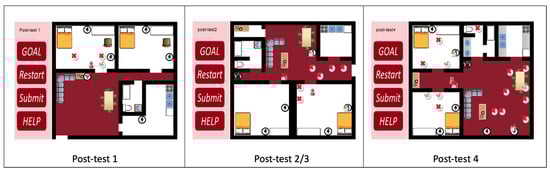 The four post-tests use three different house layouts. Post-test 1 tests three room sensors. Post-test 2 and post-test 3 use the same layout and both test six sensors, three relays, and a server. Post-test 3 requires an alternative solution from the solution submitted in post-test 2. Post-test 4 has a new layout, and it tests twelve sensors, three relays, and a server. Figure 8 shows examples of the post-tests. In post-tests, the CBLE verifies solutions if a participant wants to check her answers. The participant can continue to next test even if the CBLE detects errors.
