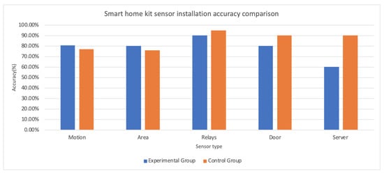 This section presents the results of the experiment. Table 2 shows the results of the actual installation. Figure 10 presents comparisons of sensor installation accuracy in percentage. The experiment enrolled ten participants; each of them installed the devices once. Table 2 shows the types of devices, and the number of devices under each type is different. The table also records “failures”, which is the number of times that the device type was installed at an incorrect position. A server installation failed when it was not connected correctly to the Ethernet. The average accuracy rate represents the mean value of the number of correctly installed devices over the total number of devices in each group.