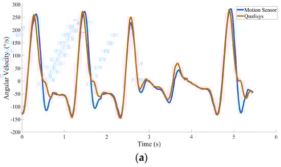 Figure 8 shows one example of the acceleration and angular velocity signals depicting one trial of motion on the dominant axis during the 10-m walk test. The aligned angular velocity measured by the motion sensor (peak = 224.57 ± 1 52°/s; trough = −130.84 ± 39.75°/s) and optical motion capture system (peak = 224.68 ± 161°/s; trough = −122.12 ± 49.33°/s) was similar. Peaks and troughs showed highly significant correlations (the mean correlation was 0.92). The acceleration comparison results showed that the peaks (motion sensor = 1.07 ± 0.67 m/s2; optical motion capture system = 1.23 ± 1.2 m/s2) and troughs (motion sensor = −1.86 ± 0.36 m/s2; optical motion capture system = −1.76 ± 0.34 m/s2) did not show a large difference either, with a highly significant correlation (the mean correlation is 0.92, p ≤ 0.001).
