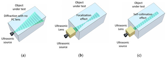 Schematic representation of ultrasound propagation beam into the object under test. Beam diffraction of the ultrasonic source when it is directly coupled to the sample (a), coupled to the object under test through acoustic lens focusing waves inside the object (b) and coupled through an acoustic lens generating self-collimation of waves inside the object (c).