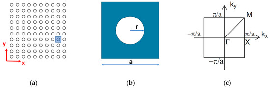 Here, we consider a 2D PC consisting of a periodic distribution of cylindrical holes (air) drilled in an aluminum block, arranged in a square periodic lattice, as schematically shown in Figure 2a. The square unit cell in real space is shown in Figure 2b, where a is the lattice constant and r is the radius of the air hole. Figure 2c shows the unit cell in the reciprocal space with the Bloch vector representation of the Γ-X-M directions where (kx, ky) are wave vectors in the 2D reciprocal space.