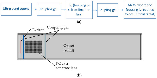 (a) Block diagram of the experimental configuration where PC is used as a focusing or a collimation lens that is inserted halfway between ultrasonic transducer and object under test. An acoustic coupling gel is inserted at the interface between source, PC lens and solid object, (b) layout of simulation model for the case of using PC lens attached to metallic structure with coupling.