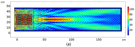 Figure 8 shows the results of propagation through a 30 × 20 element PC used as a focusing/collimation lens. The focusing/collimation effect of the PC is frequency-dependent, as pointed out earlier. The width of the input source of excitation and the PC lens is the same as the object under test (i.e., they cover all the object surface area). The wave field in the solid is blurred by a pattern of fringes that is due to the multiple reflections of waves in the coupling layers. Figure 8a shows a clear focalization effect obtained at 172 kHz, in comparison with Figure 8b where the same frequency propagates in aluminium in the absence of the PC. On the other hand, the collimation effect is observed at the frequency of 193 kHz with effect of PC (Figure 8c), in comparison with the same situation with no PC (Figure 8d).