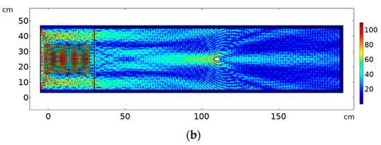 We considered the ultrasound source coupled to the PC lens shown and analysed in Figure 7, and we include a defect in the solid target. Figure 11 shows a schematic representation of the defect embedded in the target material. We simulate the ultrasound propagation and we detect the transmitted ultrasound waves at the opposite side of the target (transmission NDT mode).This topology is used in many NDT analyses in the literature as well as beam forming for NDT applications [35,36,37,38,39,40].We compare the results obtained in the case of a healthy sample (shown in Figure 8) with those corresponding to a sample with an elliptical crack (elliptical trigonometric orthogonal axes’ parameters a, b = 1, 2 cm respectively) and simulated as an air filled crack at a horizontal distance of 80 cm from the left border of the aluminium target specimen and vertically positioned at 20 cm in the middle of the specimen with and without using the ultrasound lens formed by the PC.