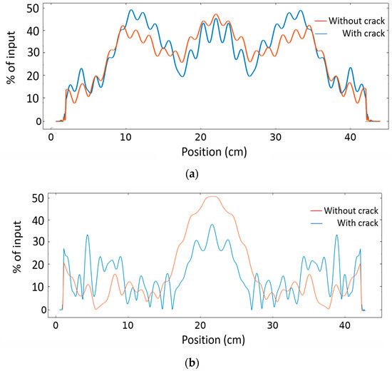 abs(u) with horizontal axis representing the position on a vertical line on the metallic sample at a distance 30 cm to the right of the crack, in case of (a) a sample without/with embedded crack when no PC lens is used (b) a sample without/with embedded crack when a PC lens is used.