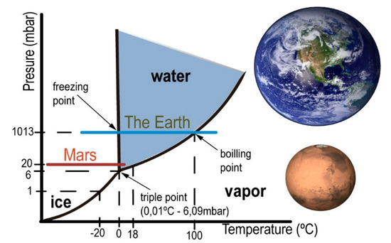 Water is a prerequisite for life [5]. This constitutes the main astrobiology paradigm [6,7,8]. Water in the gaseous state is found mostly in the universe in the interstellar medium [9]. Water as ice abounds in the interior of some moons, such as Europe [10]; at the poles of rocky planets, such as Earth and Mars [11]; and in interplanetary objects, such as comets and asteroids [12]. In liquid state, water is located on the surface of the Earth and interior of satellites of the giant planets [13]. In principle, liquid water and vacuum are incompatible. Only under special conditions, liquid water can be introduced in a vacuum system. The water vapor pressure indicates that under certain conditions of pressure and temperature [14], it is possible for water to remain in liquid state (Figure 1).