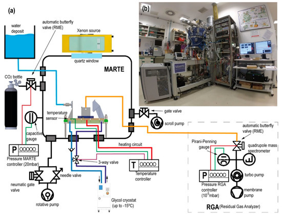 (a) Technical illustration of the MARTE simulation system (sample holder temperature control, gas composition, and pressure control). (b) Photograph of the MARTE simulation system.