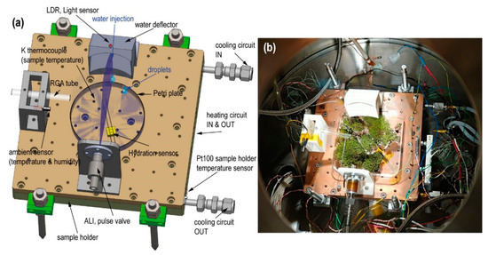 (a) Sample holder technical draw (top view) with all instrumentation for the water injection system. (b) Photograph (top view) of the experimental assembly with biological sample (moss).