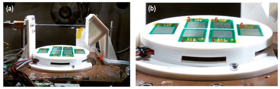 Figure 8a illustrates the radiation sources in MARTE. We simulated the solar radiation with a Xenon source because it has a similar spectrum and irradiation levels can be scaled to the red planet’s surface. We used the Hamamatsu 150W L11033 lamp and a spectral range between 185 and 2000 nm mounted on the E7536 housing. The Xenon source is placed 80 cm from the surface, separated from the vacuum by an ISO 150 LF quartz window with a 90% optical transmission of UVA, and is far enough to minimize infrared radiation. Using the lens and the housing mirror, we adjusted the beam so that it covered the exposed surface of the biological samples in a homogeneous way (see Figure 8b,c). Finally, we used an RGB (red, green, blue)-type LED (light-emitting diode) lamp and halogen or LED sources in different positions that facilitate the contrast when taking pictures inside MARTE.