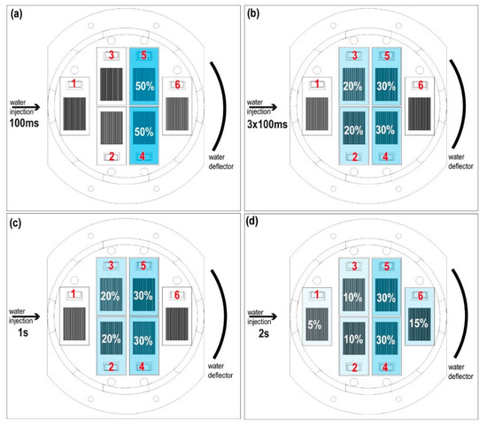 Top view of the “Dew sensor”. Position and coating (%) of water detectors for different injection times. The percentage and the color intensity show the total water droplets distribution. The red numbers indicate the drop water sensor position. (a) Pulse of 100 ms. (b) Combination of 2 series of 3 consecutive pulses of 100 ms with 1 s between series. (c) Pulse of 1 s. (d) Pulse of 2 s.
