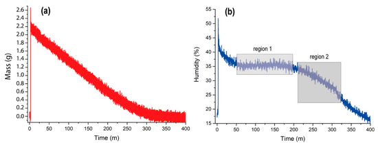 Figure 6b shows the relative humidity measured by the ambient sensor (see Figure 3), which is formed by a combination between a Honeywell HIH-400 relative humidity sensor, and an RTD (resistance temperature device) temperature sensor type Pt1000 class A. At injection, there is an instantaneous evaporation that increases the relative humidity sharply and decreases the ambient temperature, resulting in short injection times (around 10 ms) and low-vacuum micro ice crystals [61]. In our case, once the water is distributed homogeneously through the Petri plate (the injection causes a sudden sharp rise in pressure), the humidity decreases until the pressure is stabilized at 20 mbar in MARTE. From the 50th minute onward, relative humidity is maintained at 35% (region 1 of Figure 6b) and begins to decay from the 200th minute to the 325th minute at 25%, which is when all the water from the Petri plate has evaporated (region 2 of Figure 6b). As of minute 325, the relative humidity decays exponentially to the threshold value of 20 mbar in the MARTE atmosphere.