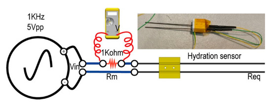 Technical illustration and photograph of the hydration measurement system. It consists of a function generator, a voltmeter, a resistance of 1 KOhm, and the hydration sensor.