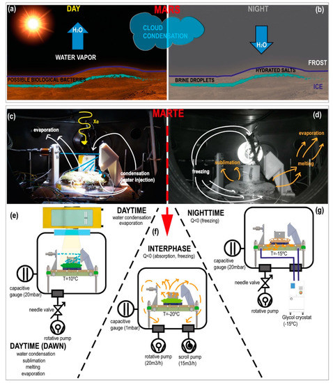Pictures and technical illustrations of the hydrological cycle in the MARTE vacuum system and on the red planet. (a) Daytime in Mars. (b) Nighttime in Mars. (c) Daytime in MARTE. (d) Nighttime in MARTE. (e) Technical illustration of daytime in MARTE. (f) Technical configuration in MARTE in the interphase between daytime and nighttime. (g) Technical illustration of nighttime in MARTE.