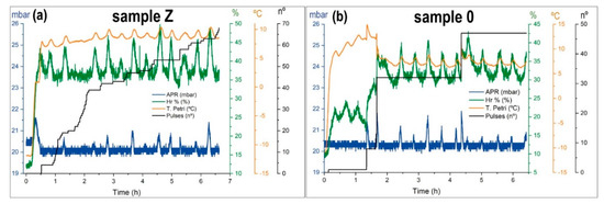 Environmental variables during the third SOL. Pressure (mbar) is in blue, relative humidity (%) in green, the sample temperature (°C) in orange. The number of pulses injected in black. (a) Sample Z. (b) sample 0.