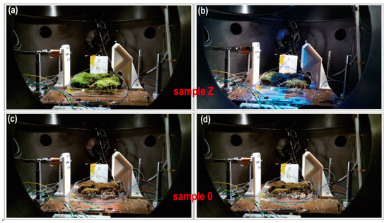 Photographs of the moss sample. (a) Photograph of sample Z before the simulation. (b) Photograph of sample Z after SOL 5. (c) Photograph of sample 0 before the simulation. (d) Photograph of sample 0 after SOL 5.