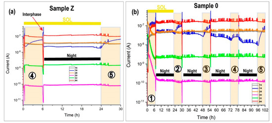 MID of samples Z and 0. The shaded areas correspond to daytime. The ions (q/m) 16, 18, 28, 30, 32, and 44 correspond mainly to oxygen, water, nitrogen, nitrogen dioxide, and carbon dioxide. The numbers correspond to the SOL number. The interphase is the region between de daytime and the nighttime. (a) MID of sample Z from the fourth dawn. (b) Complete MID of sample 0.