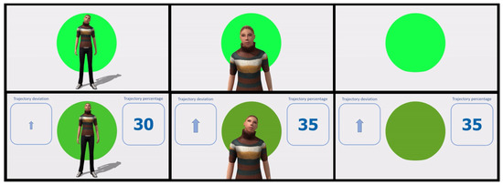 In the initial phase of the user interface design process, a number of possible cues were identified. Individuals in a team communicate by gaze and non-verbal communication [,] and to replicate this, the current study used an avatar representing the robot and added head movements to indicate trajectory deviation. In addition, trajectory deviation and trajectory percentage parameters were introduced as graphical symbols dynamically providing information about the task to the user. Finally, the user interface display used a background with a universally known paradigm of a traffic light to establish how far from the optimal path the robot is (from green color indicating on an optimal path to red indicating a strong deviation).