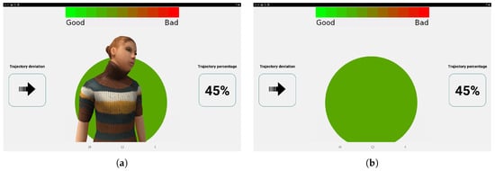 Two types of the user interface were selected from User Study 1 and adjusted according to the participant suggestions; specifically, the dashboard with the avatar (torso) (Figure 3a) and the dashboard without the avatar (Figure 3b). The two user interfaces included the following cues: