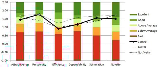 Finally, the subjective evaluation of participants’ experience was measured with the User Experience Questionnaire (UEQ). Although the results were not significant , the score means across the factors between the conditions indicate that participants evaluated the user interface without the avatar relatively higher than the other interfaces, while the user interface with the avatar scored highest on the novelty factor. It is important to indicate that the control condition and the user interface with the avatar both ranked below average on the efficiency factor (Figure 5).