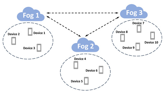 In this subsection, we discuss a concrete example of executing the proposed distributed algorithms in a fog-enabled IoT system.The architecture is illustrated in Figure 2. There are three fog nodes in the system. In Fog Area 1, there are Edge Devices 1–3, Fog Area 2 has Edge Devices 4–6, and Fog Area 3 contains Edge Devices 7–10. Let be the set of neighbors for fog node i; then, it can be seen that , , . Algorithms 1 and 2 run as follows.