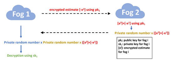 In Algorithms 1 and 2, there are three types of communication involved: edge device to edge device, edge device to its corresponding fog node, and fog node to fog node. Hence, our goal is to protect each entity’s exact private information so that it will not be leaked during the aforementioned interactions. Our proposed secure protocol is based on the Pailier cryptosystem [43], which belongs to the category of homomorphic encryption schemes [41] allowing one to directly perform computations on encrypted data. The background of Pailier encryption is introduced first and then the design of the secure privacy-preserving protocol is discussed.