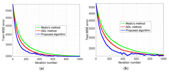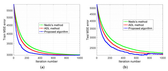 We tested our proposed algorithm in a machine learning task for a sensitive medical dataset. The dataset was from sklearn [63]. There are 10 variables: age, gender, body mass index, average blood pressure, and six blood serum measurements. The target is a quantitative measure of the diabetes disease progression. We considered a scenario that multiple hospitals would like to cooperate with each other to obtain a better prediction model equivalent to training on all the data they have. However, the sensitive data maintained by each hospital cannot be moved or leaked during their cooperation and interaction with each other. The problem aforementioned was emulated in a fog-based IoT system as follows. Each hospital maintains an edge device containing the patient data. There are 442 instances in the dataset and 50 records were used as test set and the remaining were divided into the edge devices evenly (approximately) as their local private training data. We considered two cases: (1) There are 20 edge devices and 5 fog nodes. The connections among fog nodes are randomly generated and each fog has two neighbors. (2) There are 40 edge devices and 10 fog nodes. The connections among fog nodes are randomly generated and each fog has five neighbors on average. A linear regression model was adopted for this problem and mean square error was used for measuring the training and testing error. The learning rate and the momentum parameter were set to and in all cases, respectively. The results are illustrated in Figure 10 and Figure 11, and it can be observed that our proposed distributed algorithm is consistently superior in terms of training and testing error in both cases. For instance, in Figure 10a, we can see that, for the level of training MSE error to decrease to 3120, our proposed needs 200 iterations while ADL and Nedic’s methods require around 320 and 420 iterations, respectively. It implies that our approach can be up to two times faster in reaching a reasonable accuracy. Notice that the performance gaps between our proposed algorithm and the benchmarks are not as significant as shown in the seismic imaging case study (Section 5.1). One possible reason is that the diabetes progression prediction problem is “simple” comparing to the seismic imaging problem due to the differences between their dimension of decision variables and number of instances. As a result, it would be relatively easier for all the methods to optimize the parameters to fit the data and thus the performance gap might experience a shrink in this scenario.